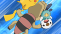 Le Pokégroupe devine ensuite qu'il veut à nouveau combattre Pikachu. L'affrontement débute aussitôt. Escroco y dévoile connaître l'attaque Mâchouille. Le combat tourne rapidement au carambolage, les deux adversaires se faisant mutuellement envoyer vers d'autres cieux suite à une Boule Élek et une Lame de Roc. Escroco retrouve peu après le Pokégroupe à leur recherche. Il les accompagne dans les recherches de Pikachu. Ils retrouvent ce dernier aux côté d'un garçon sur le point de devenir Dresseur.