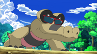 L'épisode de sa capture laisse penser qu'il peut se montrer agressif car durant un match d'entraînement contre Pikachu, il s'en prend à ce dernier après qu'une attaque Queue de Fer lui a fait perdre ses lunettes. Le même épisode laisse également deviner qu'il pourrait avoir un tempérament confiant et assuré car il se porte volontaire de lui-même pour affronter Brutapode et Crapustule lors de son Combat Duo avec Pikachu. En effet, il ne semble pas se soucier du type Eau de Crapustule contre son type Sol, et du type Insecte de Brutapode contre son type Ténèbres. Il le prouve aussi lors de NB078 lorsqu'il terrasse le puissant Polagriffe de Zhu qui possèdent notamment les capacités Poing Glace, Chute Glace et Saumure, très efficaces contre son type Sol.