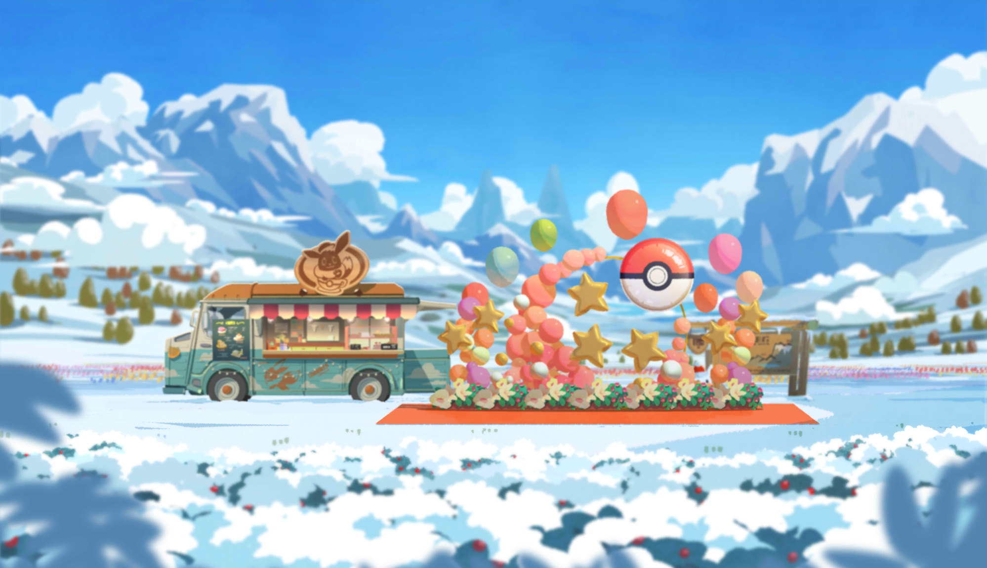 Arrière-plan des évènements aventure ventre satisfait du Nouvel An dans Pokémon Café ReMix.