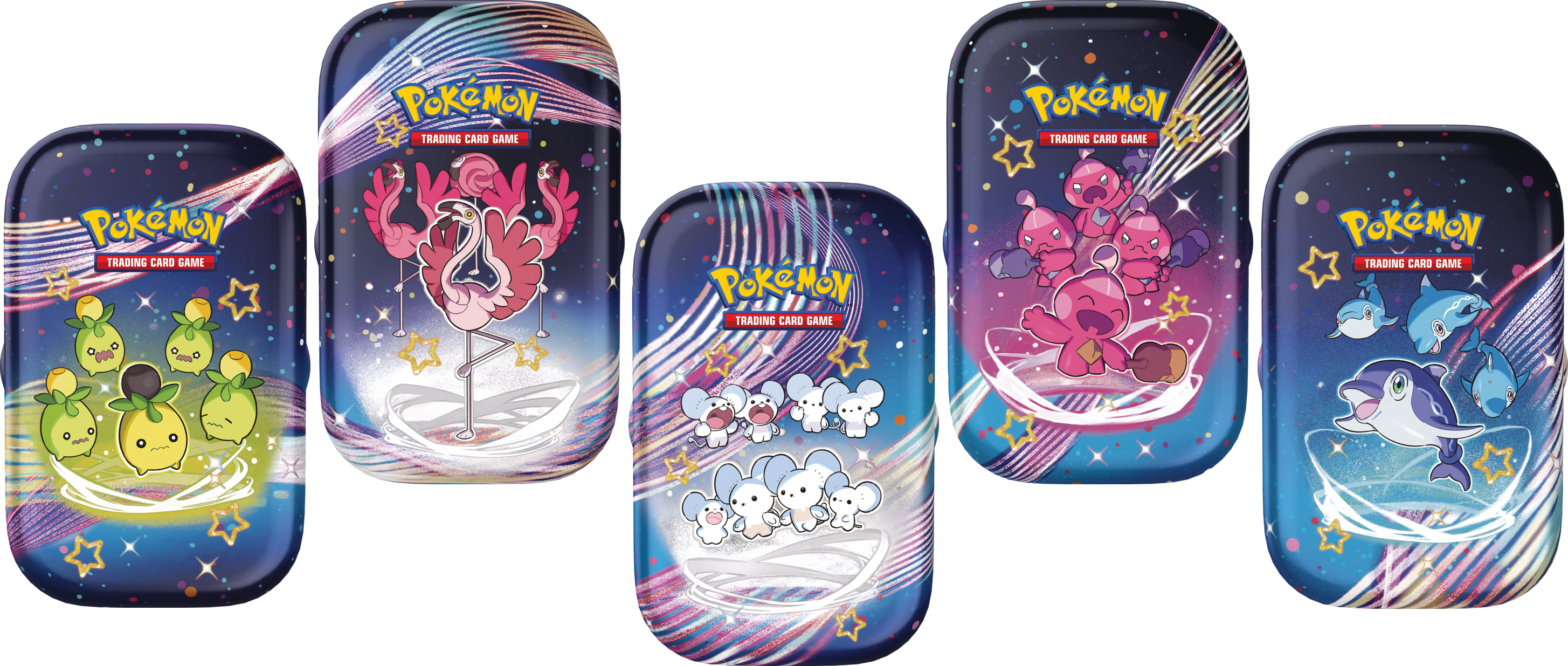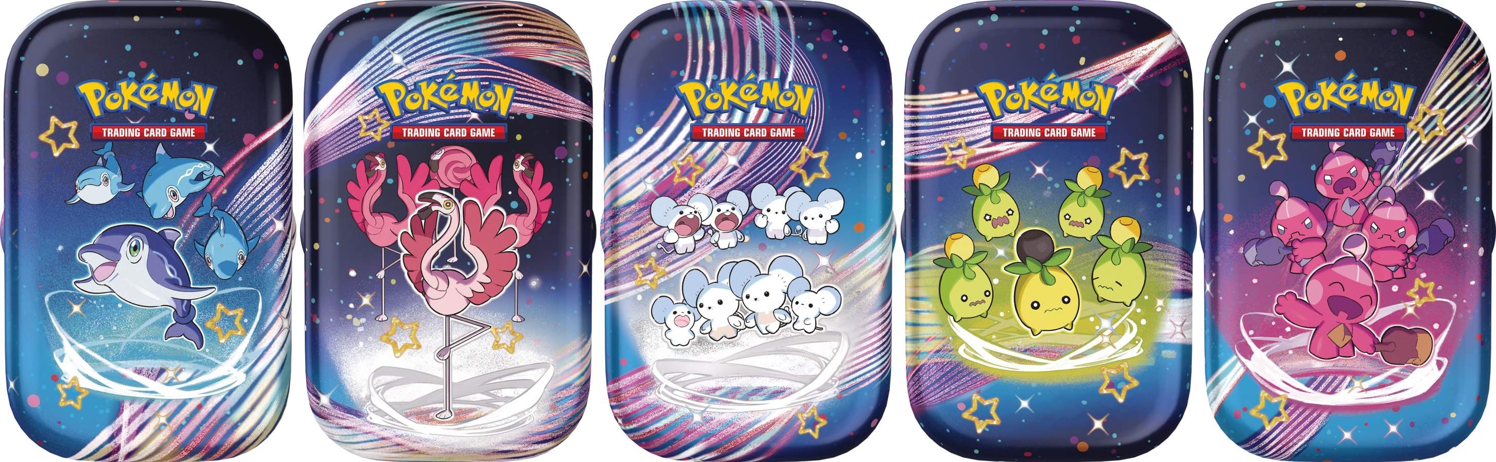 Ensemble des Mini-boîtes de la série Écarlate et Violet Destinées de Paldea contenants 2 Booster (JCC) de la série Écarlate et Violet Destinées de Paldea, représentant Dofin, Flamenroule, Famignol, Olivini et Forgerette.