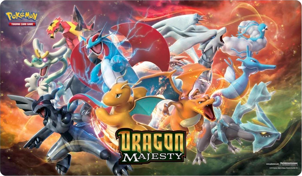 [modifier]Recto du tapis de jeu de la Dragon Majesty Super-Premium Collection, représentant Zekrom, Draïeul, Boumata, Drattak, Dracolosse, Dracaufeu, Reshiram, Altaria, Hyporoi, Kyurem.
