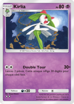 Kirlia est une carte Pokémon de l'extension Aura Palpitante, à l'effigie du Pokémon Kirlia. Elle doit être posée sur un Tarsal pour pouvoir être jouée.