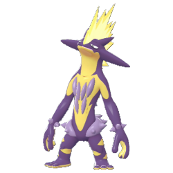 Forme Grave. Le Pokémon Punk. Il est de type Électrik et Poison. Quand il génère de l'électricité dans son corps, cela crée des vibrations semblables à celles d'une basse.